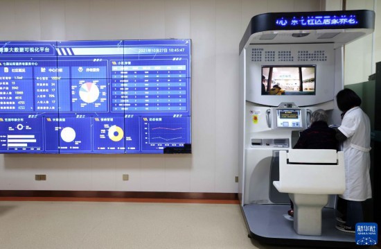 10月27日,在安徽省合肥市瑤海區(qū)東七社區(qū)居家養(yǎng)老服務(wù)中心,醫(yī)生在智能體檢一體機(jī)上為老人進(jìn)行身體健康檢測。