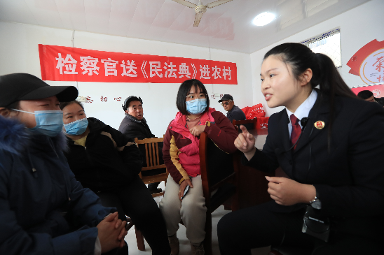 “我能把宅基地賣給城里的堂哥嗎?”“宅基地的房子為啥不能辦抵押貸款?”11月29日,山東省聊城市人民檢察院檢察官走進(jìn)“鄉(xiāng)村振興”幫扶村——高新區(qū)許營鎮(zhèn)龍匯新村,圍繞土地承包經(jīng)營權(quán)、宅基地使用權(quán)等農(nóng)民權(quán)益保障熱點(diǎn)問題,依據(jù)民法典現(xiàn)場解答村民疑問并發(fā)放宣傳資料。圖為檢察官為村民講解相關(guān)法律知識(shí)。