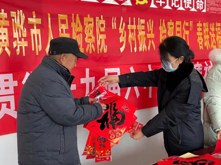 近日,河北省黃驊市人民檢察院干警來到羊三木回族鄉(xiāng)三虎莊村,開展“鄉(xiāng)村振興·檢察同行”春聯(lián)送?;顒?。該院已連續(xù)多年開展送?;顒?,為農(nóng)村精神文明建設(shè)貢獻檢察力量。圖為檢察干警向村民贈送春聯(lián)。 本報記者 周宵鵬 本報通訊員 李宴俊 攝