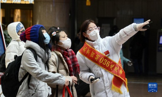 1月28日,北京西站愛心服務(wù)隊(duì)的隊(duì)員指導(dǎo)旅客乘車出行。