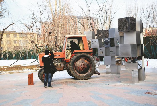 市民喜歡在園區(qū)內(nèi)的拖拉機(jī)上拍照留念。(記者韓玉紅 攝)