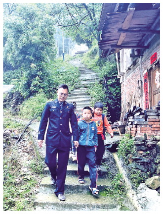 上圖 何峰為孩子們補(bǔ)課后,翻山越嶺送他們回家。