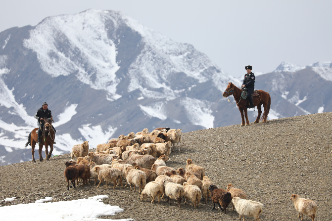 近日,隨著氣溫逐步回暖,新疆維吾爾自治區(qū)阿勒泰地區(qū)青河縣的牧民們都陸續(xù)開始了轉場作業(yè)。連日來,阿勒泰邊境管理支隊青河邊境管理大隊阿尕什敖包邊境派出所選派騎馬經(jīng)驗豐富的民警成立“牧羊人”小分隊,深入邊境轄區(qū)幫助牧民們共同放牧,全力保障牧民轉場的順利進行。圖為民警助力牧民轉場。