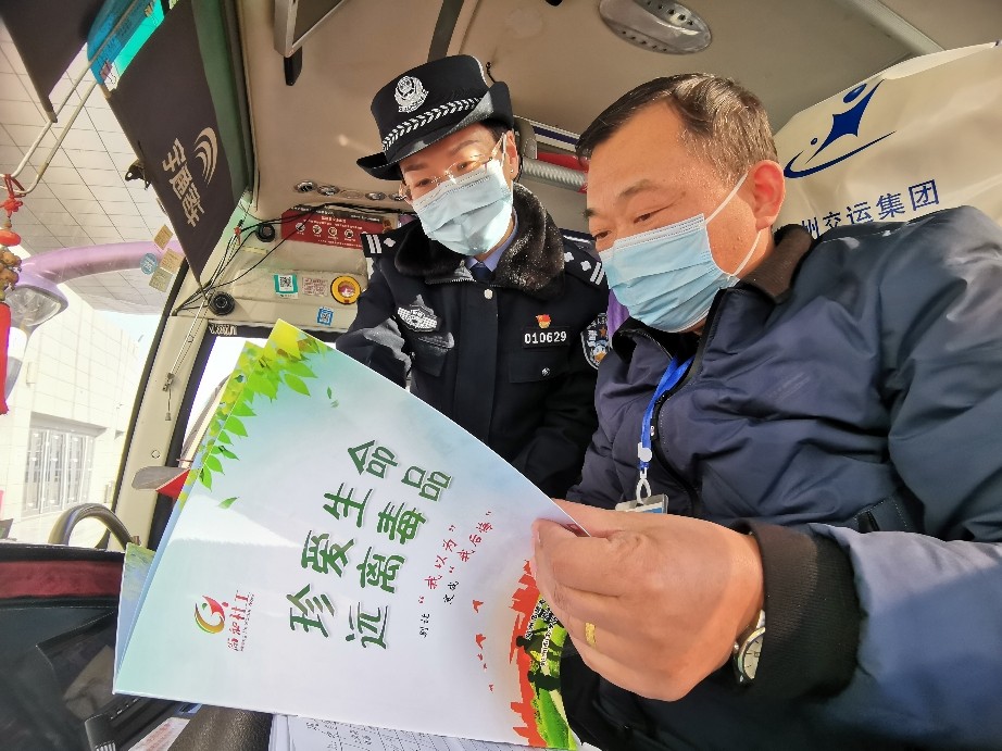 圖① 王霞在客運(yùn)班車(chē)上向旅客講解禁毒常識(shí)。