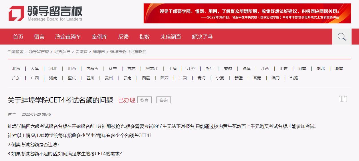 3月20日,有網(wǎng)民在人民網(wǎng)“領(lǐng)導(dǎo)留言板”向蚌埠市委書記留言稱,蚌埠學(xué)院四六級(jí)考試報(bào)名名額在開始報(bào)名前1分鐘即被搶光,很多需要考試的學(xué)生無法正常報(bào)名,只能通過校內(nèi)黃牛花數(shù)百上千元購買考試名額才能參加考試。請(qǐng)問蚌埠學(xué)院每年招收多少學(xué)生?每年有多少個(gè)名額考CET4?倒賣考試名額是否違法?如果考試名額不足,如何滿足學(xué)生的考CET4的需求?