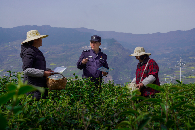 近日,湖北省宜昌市興山縣第一批春茶開始采摘。圖為3月27日,在興山縣峽口鎮(zhèn)普安村,峽口鎮(zhèn)派出所民警利用周末時間走進茶園,宣傳防范電信網絡詐騙和農村道路交通安全知識。 法治日報全媒體記者 劉志月 通訊員 王鵬程 攝