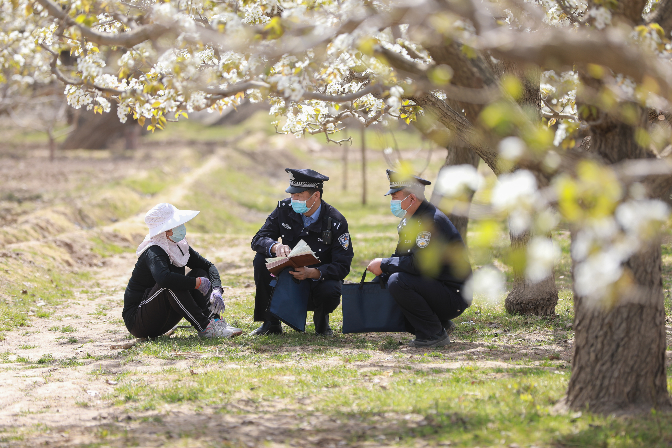 4月初,甘肅省皋蘭縣什川古鎮(zhèn)的梨園內(nèi)梨花競相開放,受疫情影響,梨園旅游項(xiàng)目暫時(shí)關(guān)閉,當(dāng)?shù)毓r(nóng)們忙著授粉,皋蘭縣公安局什川派出所民警穿梭在梨園田間地頭,向群眾普及安全防范知識(shí),切實(shí)為農(nóng)業(yè)生產(chǎn)保駕護(hù)航。圖為4月6日,民警為果農(nóng)宣講安全防范知識(shí)。