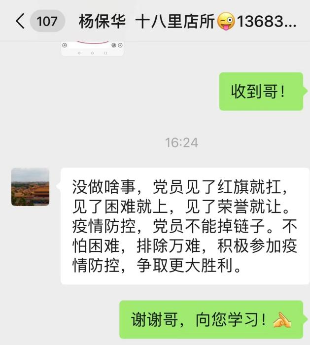 楊保華同志的妻子是一位教師,夫妻兩人都奮戰(zhàn)在各自的崗位上,家中還有一個(gè)年僅5歲需要照看的“二寶”。忙碌于下沉一線(xiàn)的楊保華同志,看到同樣辛勞的妻子和疏于照顧的孩子,心中十分愧疚??伤麉s依然無(wú)怨無(wú)悔,將對(duì)家人的愧疚化為工作的動(dòng)力,繼續(xù)堅(jiān)守在工作崗位上?!罢l(shuí)家沒(méi)有困難?大家都在克服困難,疫情防控,黨員不能掉鏈子。”他堅(jiān)定地說(shuō)道。楊保華同志的付出和奉獻(xiàn)盡顯舍小家、為大家的大愛(ài)情懷。