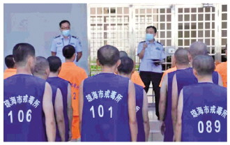 圖為蔡小勇(右)在給戒毒人員上集體教育課。 瓊海市強制隔離戒毒所供圖