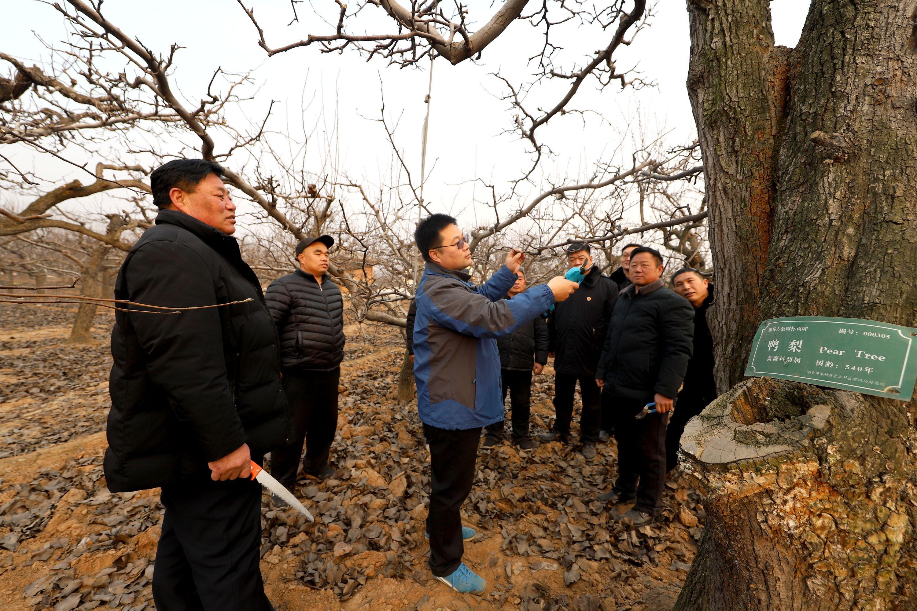 1月4日,河北省魏縣人民檢察院公益訴訟檢察官邀請該縣林果服務(wù)中心果樹專家來到東南溫村梨園,指導(dǎo)梨農(nóng)對古梨樹進(jìn)行冬季剪枝整枝管理,為明年古梨樹豐產(chǎn)、梨農(nóng)增收做好準(zhǔn)備。圖為專家向梨農(nóng)講解古梨樹的修剪要求和技巧。