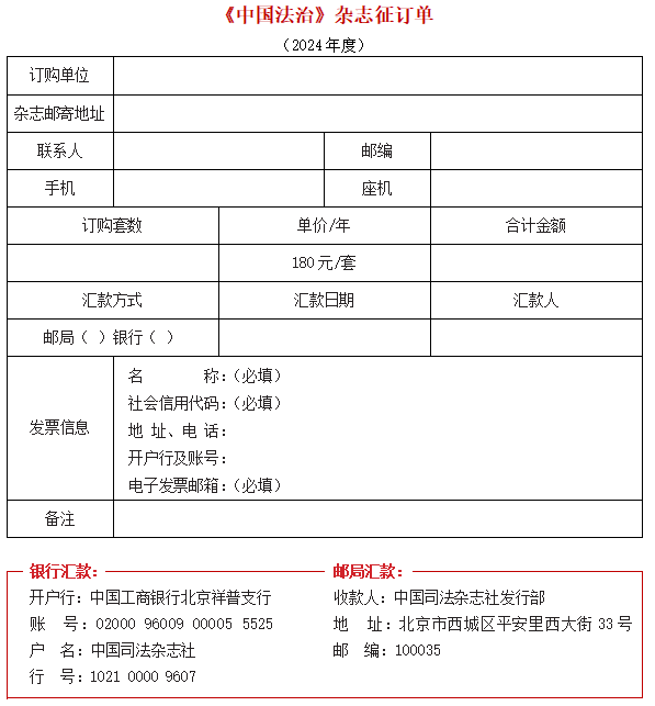 ★匯款時(shí)請(qǐng)務(wù)必標(biāo)明“中國(guó)法治+訂購(gòu)套數(shù)”,個(gè)人匯款另需注明“單位名稱(chēng)”。
