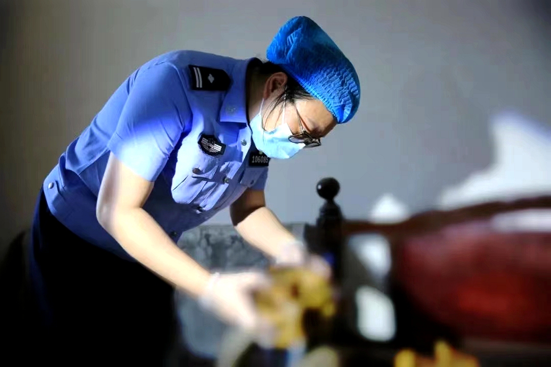 一副手套一個口罩,沒有防毒面具沒有防護服,在場的同事都為這名剛剛穿上白大褂的“黃毛丫頭”捏了一把汗。查看了現(xiàn)場環(huán)境之后,她時而站立時而俯身進行拍照,觀察尸斑、尸僵以及腐敗的程度,最后蹲在了尸體前,側(cè)身從勘查箱中拿出鑷子、放大鏡、試管以及證物袋等工具,尋找可能存在的傷痕點,小心翼翼地提取血液、體液以及殘留物,結(jié)合氣候和室內(nèi)環(huán)境給出綜合判斷。隨著時針滴答滴答向前,死者生前受侵害的可能性逐步被排除,真相也在逐步走近——“死者生前沒有受到侵害的跡象,基本可以排除他殺可能”。就在所有人都屏息凝視的時候,龐宜婧堅定地回答打破寂靜。