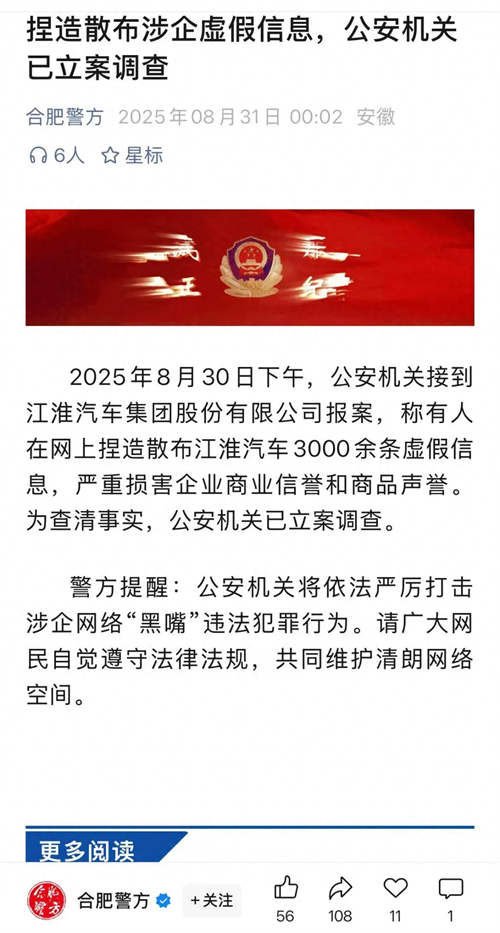8月31日凌晨,“合肥警方”微信公眾號發(fā)文稱,2025年8月30日下午,公安機關接到江淮汽車集團股份有限公司報案,稱有人在網上捏造散布江淮汽車3000余條虛假信息,嚴重損害企業(yè)商業(yè)信譽和商品聲譽。為查清事實,公安機關已立案調查。