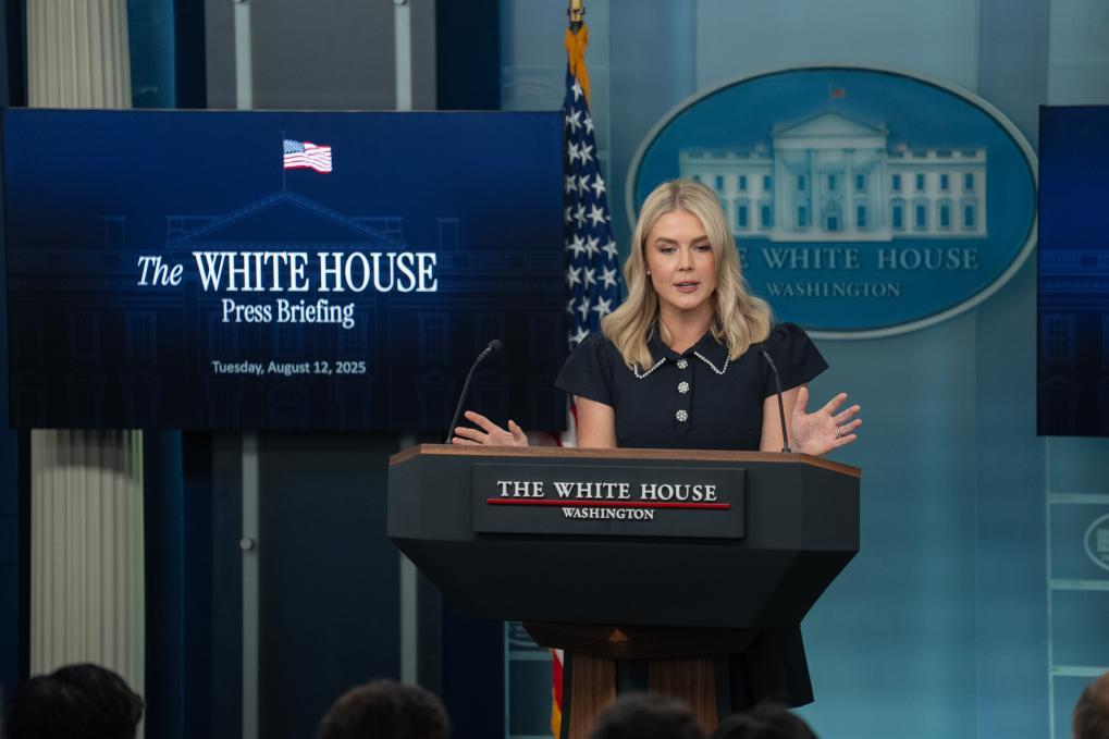 8月12日,在美國首都華盛頓白宮,白宮新聞秘書萊維特出席記者會。新華社記者胡友松攝