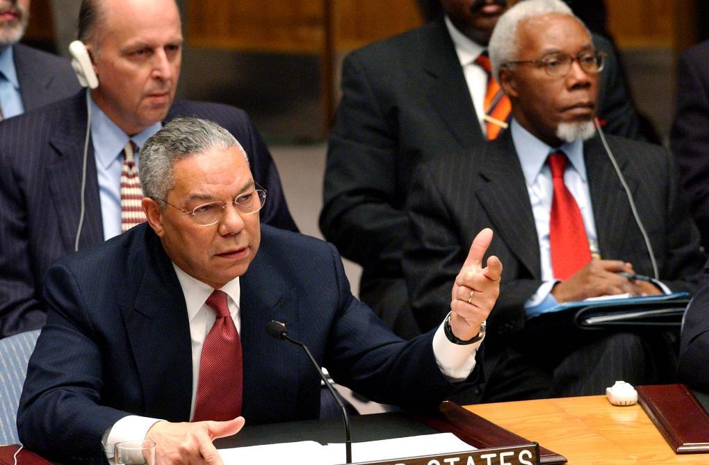 2003年2月5日,時任美國國務(wù)卿鮑威爾在聯(lián)合國安理會就伊拉克問題舉行的公開會議上向安理會通報有關(guān)伊拉克藏匿大規(guī)模殺傷性武器的所謂“證據(jù)”。 新華社記者彭張青攝(數(shù)碼傳真照片)