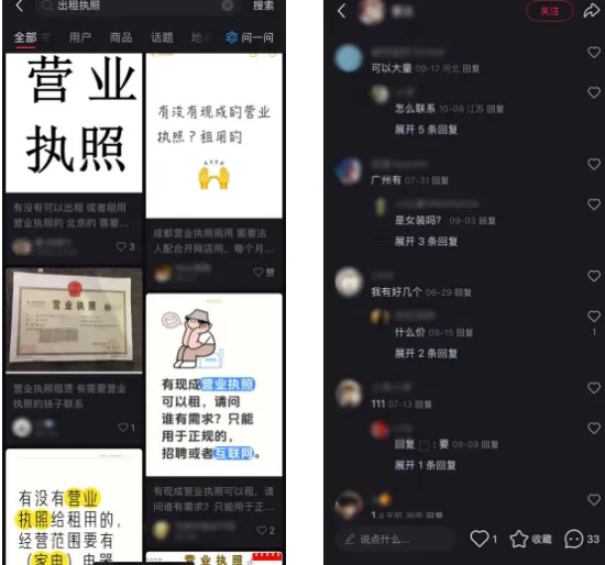 法治網(wǎng)記者在某社交平臺(tái)以“出租執(zhí)照”為關(guān)鍵詞進(jìn)行檢索,瞬間便出現(xiàn)大量相關(guān)信息。此類帖子大多以“閑置營(yíng)業(yè)執(zhí)照出租”為引流點(diǎn),評(píng)論區(qū)中咨詢租賃細(xì)節(jié)、問(wèn)價(jià)的用戶不在少數(shù)。