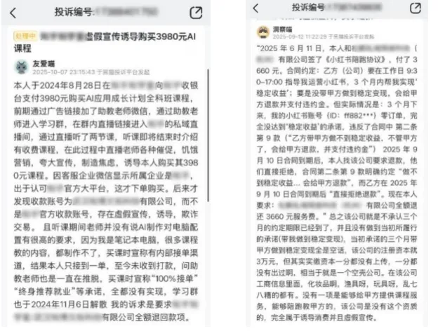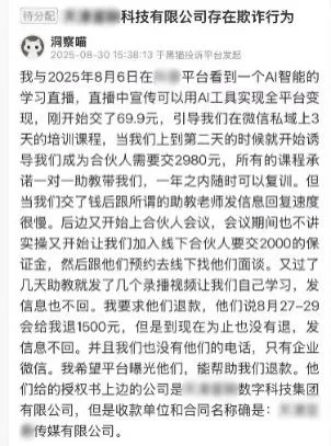一位消費(fèi)者投訴稱,在某平臺(tái)看到“AI智能變現(xiàn)”直播,先被收取69.9元入門費(fèi),隨后在微信私域中被誘導(dǎo)繳納2980元成為“合伙人”,之后又被要求交2000元保證金參加線下會(huì)議。結(jié)果課程內(nèi)容僅為幾個(gè)錄播視頻,助教隨后失聯(lián),承諾的退款也遲遲未到賬。