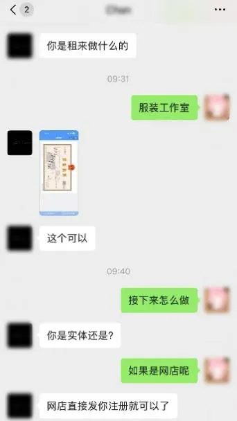 法治網(wǎng)記者以需要注冊(cè)服裝類網(wǎng)店為由添加賣家微信后,對(duì)方在了解用途后,隨即發(fā)來(lái)相關(guān)貿(mào)易類公司的營(yíng)業(yè)執(zhí)照,并直言租用后可直接用于網(wǎng)店注冊(cè),全程未對(duì)租用方的情況進(jìn)行了解。