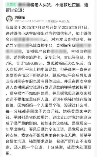 法治網(wǎng)記者注意到,在黑貓投訴平臺(tái)上,直播電商注冊(cè)主體和實(shí)際運(yùn)營(yíng)團(tuán)隊(duì)、收款單位不一致現(xiàn)象尤為突出,有多達(dá)600余條相關(guān)投訴。其中,有消費(fèi)者反映,一些商家在出售產(chǎn)品后即銷聲匿跡;還有的商家注冊(cè)主體、簽約主體和收款單位各不相同,交易涉及多家關(guān)聯(lián)公司。這種“分身術(shù)”式的運(yùn)營(yíng)模式,導(dǎo)致消費(fèi)者在尋求售后時(shí)常常被“踢皮球”,甚至壓根找不到售后,最終面臨被拉黑、維權(quán)無(wú)門的困境。