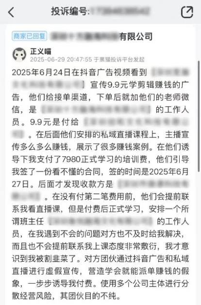 另一位消費(fèi)者則表示,之前看到某知識(shí)付費(fèi)商家宣傳“快速盈利”“100%接單”“終身推薦就業(yè)”承諾,沒(méi)想到付款后竟發(fā)現(xiàn)收款主體是陌生企業(yè)而非某知名大平臺(tái);從廣告推廣運(yùn)營(yíng)、前期對(duì)接到9.9元體驗(yàn)課引流以及正式培訓(xùn)費(fèi)收款方,再到后期服務(wù)的班主任,整個(gè)過(guò)程竟涉及五家不同公司主體……