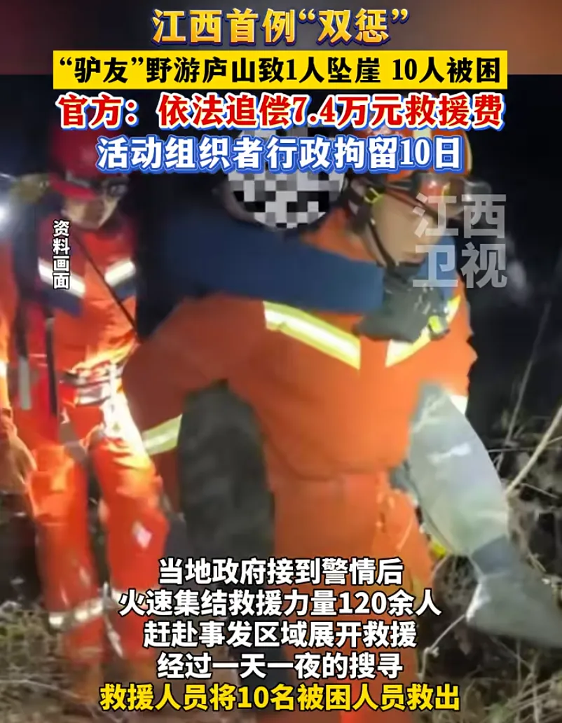 針對廬山“9·27”驢友野游救援事件,當?shù)卣婪ㄒ酪?guī)向被困“驢友”追償7.4萬元救援費用。此前,該野游活動組織者已被行政拘留10日。