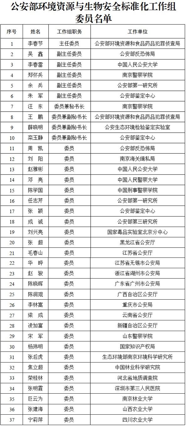 第一屆公安部環(huán)境資源與生物安全標準化工作組擬由37名委員組成(名單附后),李春節(jié)任主任委員,吳鑫、李春雷、鄭懷兵、余兵、朱軍任副主任委員,汪東任秘書長,王鵬、薛曉明、欒玉靜任副秘書長。秘書處由南京警察學院承擔。