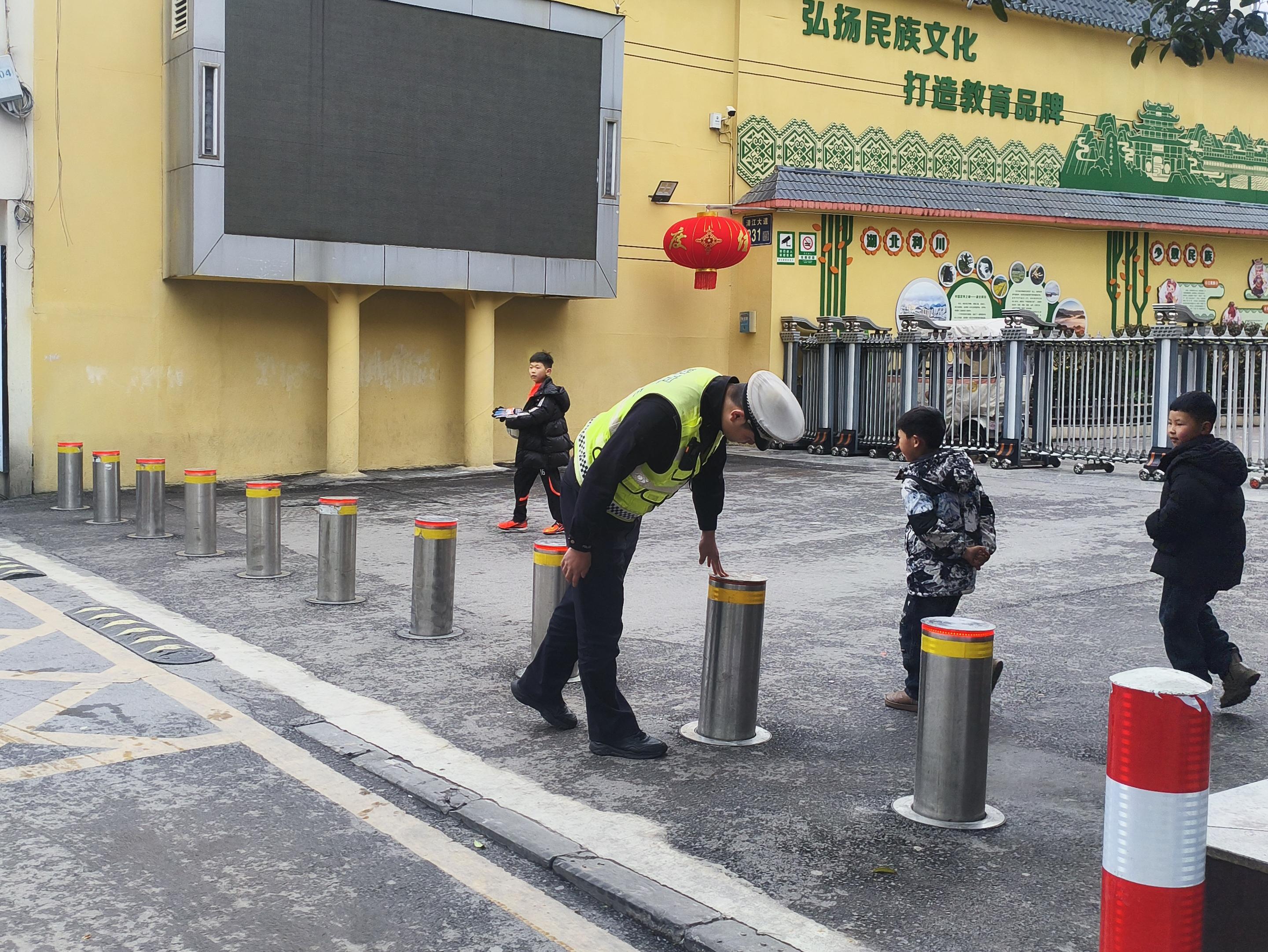 3月2日,恩施州利川市公安局交警大隊民警在市第一民族實驗小學(xué)查看新建的防沖撞設(shè)備。