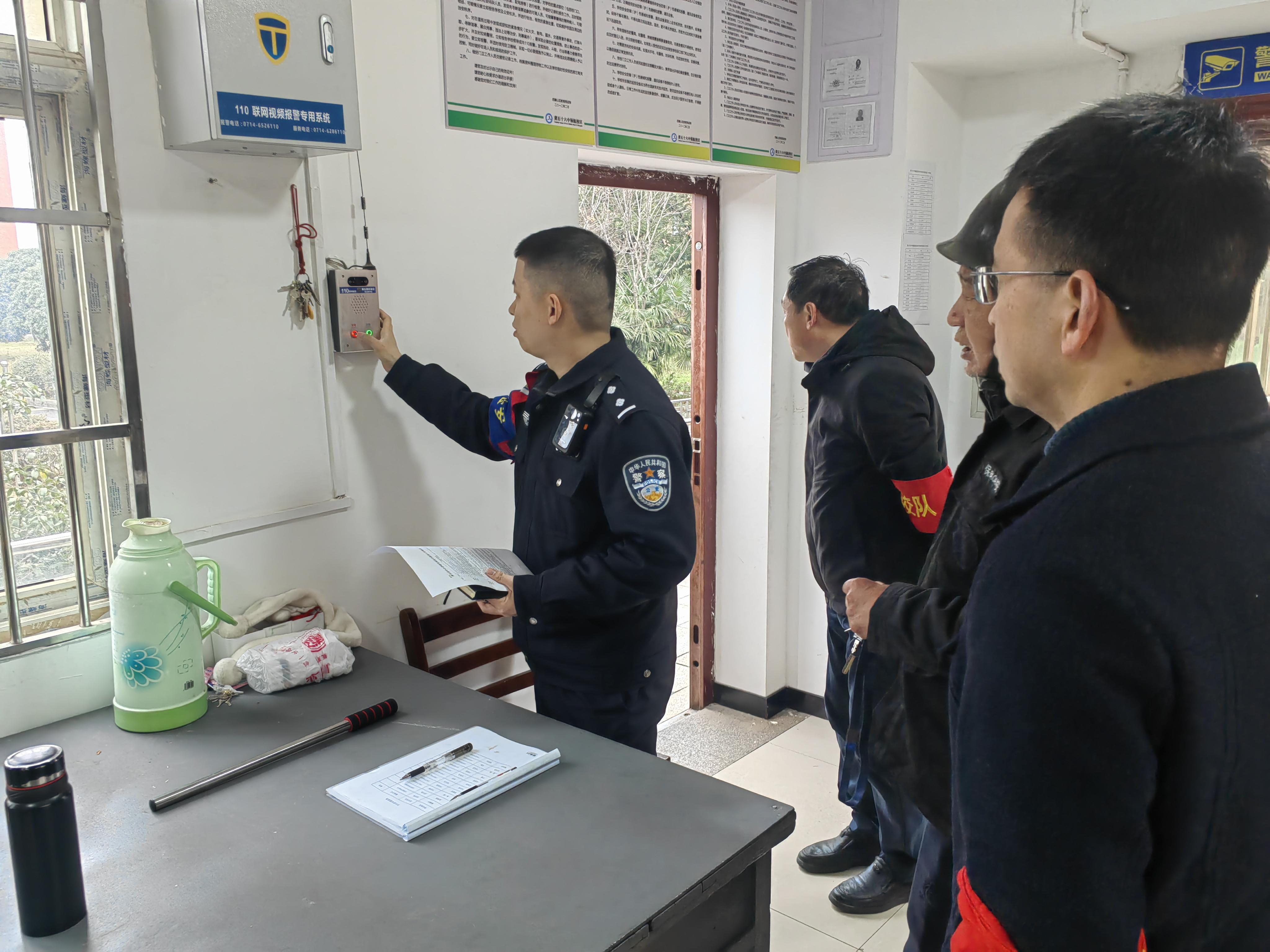 3月2日,黃石市公安局西塞山區(qū)分局牧羊湖派出所民警前往市第十六中學(xué)開展隱患排查,測試一鍵報警裝置靈敏度。