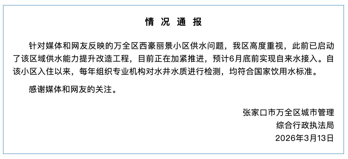3月13日,張家口市萬全區(qū)城市管理綜合行政執(zhí)法局發(fā)布情況通報,針對媒體和網友反映的萬全區(qū)西豪麗景小區(qū)供水問題,該區(qū)高度重視,此前已啟動了該區(qū)域供水能力提升改造工程,目前正在加緊推進,預計6月底前實現自來水接入。自該小區(qū)入住以來,每年組織專業(yè)機構對水井水質進行檢測,均符合國家飲用水標準。