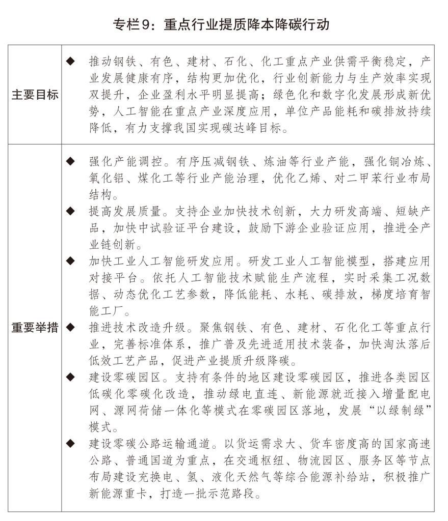一是積極穩(wěn)妥推進(jìn)碳達(dá)峰。全面實(shí)施碳排放雙控制度,制定實(shí)施碳達(dá)峰碳中和綜合評(píng)價(jià)考核辦法和更高水平更高質(zhì)量做好節(jié)能降碳工作的意見,扎實(shí)開展“十五五”碳達(dá)峰行動(dòng),建立可再生能源消費(fèi)最低比重目標(biāo)制度。堅(jiān)決遏制高耗能高排放項(xiàng)目盲目發(fā)展,嚴(yán)格實(shí)施固定資產(chǎn)投資項(xiàng)目節(jié)能審查和碳排放評(píng)價(jià),對(duì)新上高耗能高排放工業(yè)項(xiàng)目實(shí)施碳排放等量或減量置換。深入推進(jìn)重點(diǎn)行業(yè)節(jié)能降碳改造,依法依規(guī)淘汰落后產(chǎn)能。制定能源強(qiáng)國(guó)建設(shè)規(guī)劃綱要,加快新型能源體系建設(shè),有序推進(jìn)“沙戈荒”新能源、西南“水風(fēng)光”清潔能源和采煤沉陷區(qū)新能源基地建設(shè),加快推進(jìn)跨省清潔能源輸電通道規(guī)劃建設(shè),因地制宜發(fā)展分布式能源,積極發(fā)展抽水蓄能、新型儲(chǔ)能,加快智能電網(wǎng)建設(shè)。推動(dòng)煤炭消費(fèi)清潔替代,開展煤電和煤化工低碳化改造,推動(dòng)現(xiàn)代煤化工與綠氫、生物質(zhì)等新能源耦合發(fā)展,加快淘汰落后燃煤設(shè)施設(shè)備。推進(jìn)零碳園區(qū)和零碳工廠建設(shè),推進(jìn)氫能綜合應(yīng)用,啟動(dòng)零碳公路運(yùn)輸通道示范路段建設(shè)。制修訂一批能耗強(qiáng)制性標(biāo)準(zhǔn)和碳排放管理相關(guān)標(biāo)準(zhǔn),強(qiáng)化行業(yè)、企業(yè)、項(xiàng)目、產(chǎn)品碳排放管理支撐。完善碳排放統(tǒng)計(jì)核算、碳足跡管理體系,建立綠色貿(mào)易進(jìn)出口統(tǒng)計(jì)制度和監(jiān)測(cè)體系。進(jìn)一步擴(kuò)大碳排放權(quán)交易市場(chǎng)覆蓋范圍,完善全國(guó)溫室氣體自愿減排交易市場(chǎng)制度體系。