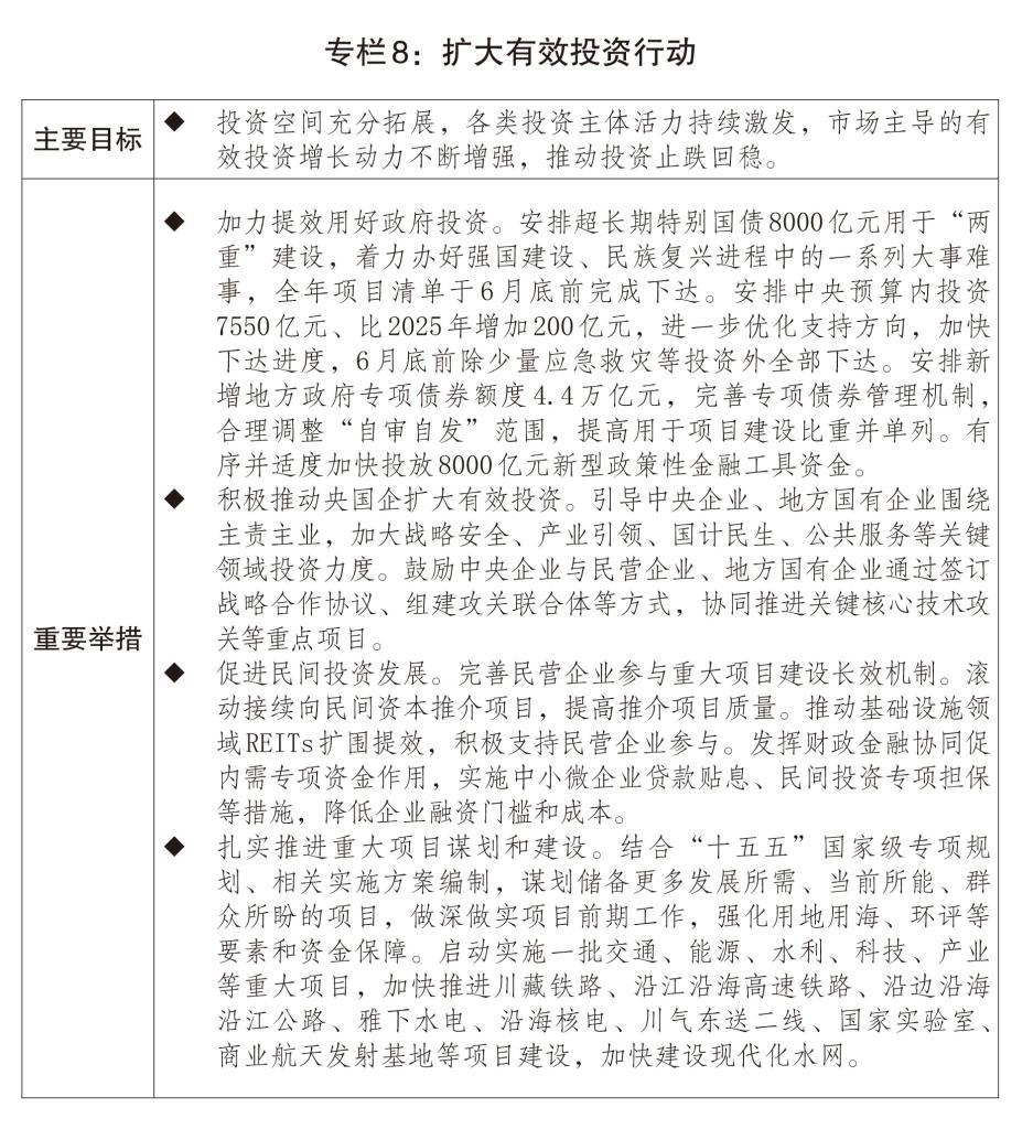 二是投資補(bǔ)短板調(diào)結(jié)構(gòu)加力增效。統(tǒng)籌用好各類資金支持重點(diǎn)項(xiàng)目建設(shè),持續(xù)優(yōu)化中央預(yù)算內(nèi)投資結(jié)構(gòu),擴(kuò)大地方政府專項(xiàng)債券投向領(lǐng)域和用作資本金范圍,指導(dǎo)專項(xiàng)債券“自審自發(fā)”地區(qū)扎實(shí)有序開展相關(guān)工作。推動(dòng)“十四五”規(guī)劃102項(xiàng)重大工程項(xiàng)目順利實(shí)現(xiàn)規(guī)劃目標(biāo)任務(wù),開工建設(shè)雅下水電等標(biāo)志性工程?,F(xiàn)代化基礎(chǔ)設(shè)施體系建設(shè)深入推進(jìn),國(guó)家綜合立體交通網(wǎng)“6軸7廊8通道”加速完善。規(guī)范和加強(qiáng)中央投資項(xiàng)目審批管理,提高政府投資效益。出臺(tái)進(jìn)一步促進(jìn)民間投資發(fā)展政策措施。滾動(dòng)向民間資本推介5400多個(gè)項(xiàng)目,涉及總投資超過3.9萬億元。加大基礎(chǔ)設(shè)施競(jìng)爭(zhēng)性領(lǐng)域向各類經(jīng)營(yíng)主體公平開放力度,5個(gè)新核準(zhǔn)核電項(xiàng)目引入民間資本參股比例最高達(dá)20%,大渡河丹巴水電站等項(xiàng)目加快引入民間資本。推動(dòng)基礎(chǔ)設(shè)施領(lǐng)域不動(dòng)產(chǎn)投資信托基金(REITs)擴(kuò)圍擴(kuò)容,算力設(shè)施、城鎮(zhèn)供熱、農(nóng)貿(mào)市場(chǎng)、城市更新、專業(yè)倉(cāng)庫(kù)等領(lǐng)域?qū)崿F(xiàn)“首單”發(fā)行。2025年工業(yè)投資、制造業(yè)投資分別增長(zhǎng)2.6%、0.6%。