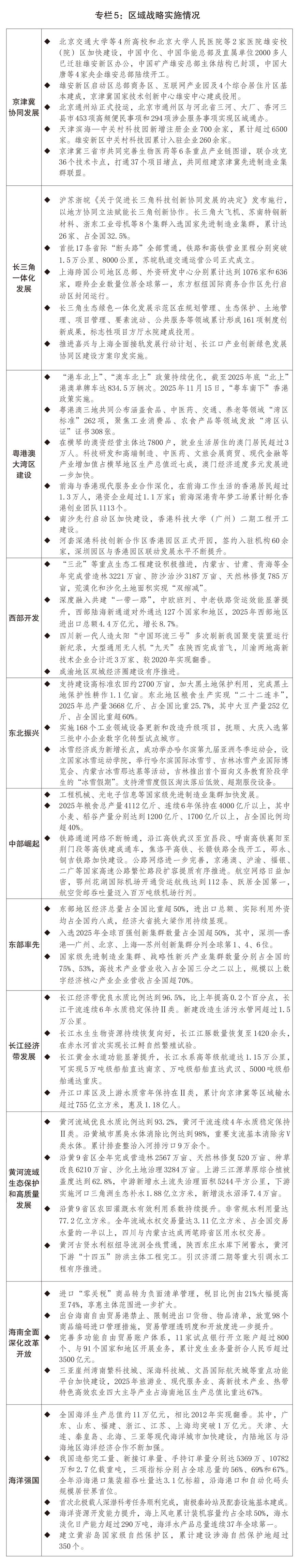 一是區(qū)域發(fā)展協(xié)調(diào)性不斷增強(qiáng)。三大動(dòng)力源地區(qū)引領(lǐng)帶動(dòng)作用鞏固提升,北京非首都功能疏解項(xiàng)目分批壓茬推進(jìn),雄安新區(qū)當(dāng)年完成投資2116億元,北京城市副中心綜合承載力不斷增強(qiáng),支持天津?yàn)I海新區(qū)提升先進(jìn)制造研發(fā)轉(zhuǎn)化能力等55條政策措施落地見效,京津冀交通、生態(tài)、科技創(chuàng)新、產(chǎn)業(yè)等領(lǐng)域協(xié)同發(fā)展水平持續(xù)提升;上海建設(shè)國(guó)際經(jīng)濟(jì)、金融、貿(mào)易、航運(yùn)、科技創(chuàng)新“五個(gè)中心”的一批首創(chuàng)性改革、引領(lǐng)性開放措施落地實(shí)施,長(zhǎng)三角生態(tài)綠色一體化發(fā)展示范區(qū)在科研平臺(tái)建設(shè)等方面獲得新一輪改革授權(quán),跨省域醫(yī)聯(lián)體醫(yī)師便利執(zhí)業(yè)等一體化制度創(chuàng)新經(jīng)驗(yàn)發(fā)布推廣;“深圳-香港-廣州”集群首次躍居全球創(chuàng)新集群首位,橫琴合作區(qū)第二階段建設(shè)44項(xiàng)政策舉措出臺(tái)實(shí)施,前海、南沙、河套開發(fā)建設(shè)實(shí)現(xiàn)新突破。四大板塊發(fā)展均衡性穩(wěn)步增強(qiáng),推進(jìn)西部大開發(fā)形成大保護(hù)、大開放、高質(zhì)量發(fā)展的新格局,在云南瑞麗、廣西欽防等沿邊地區(qū)設(shè)立產(chǎn)業(yè)協(xié)作園區(qū),特色優(yōu)勢(shì)產(chǎn)業(yè)加快集聚;東北全面振興深入推進(jìn),維護(hù)國(guó)家國(guó)防、糧食、生態(tài)、能源、產(chǎn)業(yè)“五大安全”的能力不斷增強(qiáng);中部崛起戰(zhàn)略實(shí)施取得積極成效,全國(guó)重要糧食生產(chǎn)基地、能源原材料基地、現(xiàn)代裝備制造及高技術(shù)產(chǎn)業(yè)基地和綜合交通運(yùn)輸樞紐“三基地一樞紐”戰(zhàn)略定位不斷夯實(shí);東部地區(qū)現(xiàn)代化加快推進(jìn),福建全方位推動(dòng)高質(zhì)量發(fā)展取得新成效,平潭綜合實(shí)驗(yàn)區(qū)、濟(jì)南新舊動(dòng)能轉(zhuǎn)換起步區(qū)建設(shè)扎實(shí)推進(jìn)。長(zhǎng)江、黃河兩條綠色發(fā)展帶建設(shè)深入推進(jìn),長(zhǎng)江大保護(hù)三年行動(dòng)計(jì)劃取得良好開局,生活污水管網(wǎng)補(bǔ)短板、工業(yè)園區(qū)水污染整治、沿江1公里化工騰退地塊土壤污染治理等專項(xiàng)行動(dòng)加快實(shí)施,長(zhǎng)江十年禁漁成效不斷鞏固;黃河干支流堤防加固、排污口排查整治、城鎮(zhèn)污水處理能力提升等工作扎實(shí)推進(jìn),鋼鐵、化工等重點(diǎn)行業(yè)用水效率持續(xù)提升。海南自由貿(mào)易港正式啟動(dòng)全島封關(guān)運(yùn)作,實(shí)施“一線”放開、“二線”管住、島內(nèi)自由的進(jìn)出口管理制度。海洋強(qiáng)國(guó)建設(shè)走深走實(shí),全年海洋生產(chǎn)總值約11萬億元,海洋水產(chǎn)品產(chǎn)量、船舶與海洋工程裝備市場(chǎng)份額、海運(yùn)量、海上風(fēng)電累計(jì)裝機(jī)規(guī)模等穩(wěn)居全球首位,近岸海域水質(zhì)優(yōu)良比例達(dá)84.9%。