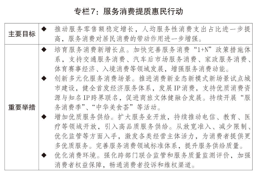 一是推動(dòng)消費(fèi)持續(xù)增長(zhǎng)。深入實(shí)施提振消費(fèi)專項(xiàng)行動(dòng)。制定實(shí)施城鄉(xiāng)居民增收計(jì)劃。完善最低工資標(biāo)準(zhǔn)調(diào)整機(jī)制,加強(qiáng)最低工資標(biāo)準(zhǔn)國(guó)家統(tǒng)籌與分類指導(dǎo),引導(dǎo)企業(yè)構(gòu)建技能導(dǎo)向的工資分配制度。引導(dǎo)上市公司更加積極開展現(xiàn)金分紅、回購(gòu)注銷,增加居民財(cái)產(chǎn)性收入。設(shè)立1000億元財(cái)政金融協(xié)同促內(nèi)需專項(xiàng)資金,組合運(yùn)用貸款貼息、融資擔(dān)保、風(fēng)險(xiǎn)補(bǔ)償?shù)确绞街С謹(jǐn)U大內(nèi)需。擴(kuò)大優(yōu)質(zhì)消費(fèi)供給,推動(dòng)商品消費(fèi)擴(kuò)容升級(jí),深入實(shí)施服務(wù)消費(fèi)提質(zhì)惠民行動(dòng),出臺(tái)服務(wù)消費(fèi)、首發(fā)經(jīng)濟(jì)、賽事經(jīng)濟(jì)、電子商務(wù)、“人工智能+消費(fèi)”、IP消費(fèi)等促進(jìn)政策,大力發(fā)展銀發(fā)經(jīng)濟(jì)、冰雪經(jīng)濟(jì),豐富嬰童產(chǎn)品、時(shí)尚“潮品”、適老化產(chǎn)品、農(nóng)業(yè)精品品牌等,深化線上線下、商旅文體健多業(yè)態(tài)消費(fèi)融合,推進(jìn)消費(fèi)新業(yè)態(tài)新模式新場(chǎng)景試點(diǎn)?;钴S線下消費(fèi),激發(fā)下沉市場(chǎng)消費(fèi)活力。擴(kuò)大個(gè)人消費(fèi)貸款和服務(wù)業(yè)經(jīng)營(yíng)主體貸款貼息政策支持領(lǐng)域,提高貼息上限,延長(zhǎng)實(shí)施期限。