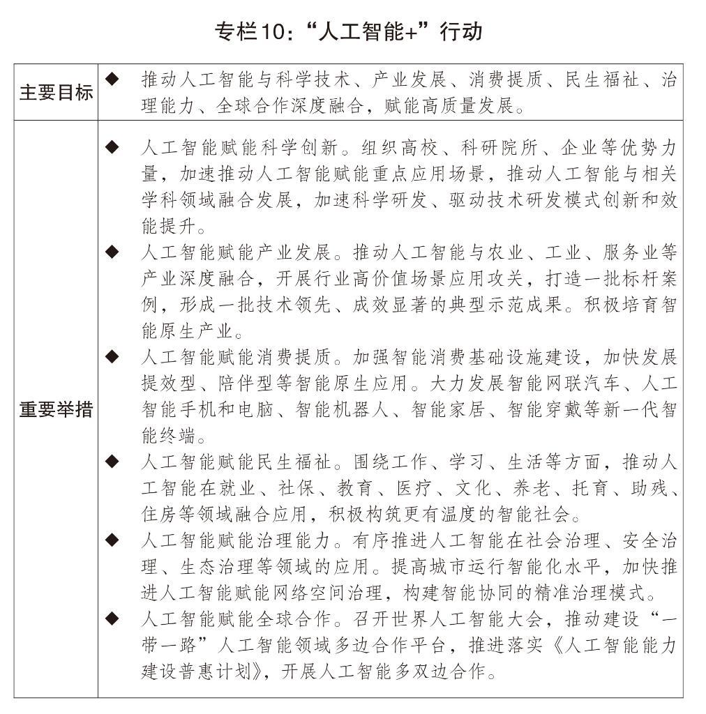 四是深入推進(jìn)數(shù)字中國(guó)建設(shè)。深入實(shí)施“人工智能+”行動(dòng),高質(zhì)量建設(shè)國(guó)家人工智能應(yīng)用中試基地,推動(dòng)人工智能在重點(diǎn)行業(yè)領(lǐng)域商業(yè)化規(guī)模化應(yīng)用。支持人工智能開源社區(qū)建設(shè),促進(jìn)模型、工具、數(shù)據(jù)集等匯聚開放。發(fā)展新一代智能終端以及模型即服務(wù)、智能體即服務(wù)等新產(chǎn)品新業(yè)態(tài)。加快建設(shè)全國(guó)一體化算力網(wǎng),優(yōu)化國(guó)家算力資源布局,支持公共云發(fā)展。推動(dòng)完善人工智能領(lǐng)域法律法規(guī)。加快構(gòu)建人工智能安全風(fēng)險(xiǎn)防治體系。健全數(shù)據(jù)要素基礎(chǔ)制度,出臺(tái)建設(shè)全國(guó)一體化數(shù)據(jù)市場(chǎng)的政策,積極推進(jìn)數(shù)據(jù)流通利用基礎(chǔ)設(shè)施建設(shè)和運(yùn)營(yíng),深入推進(jìn)數(shù)據(jù)要素綜合試驗(yàn)區(qū)建設(shè)。加快公共數(shù)據(jù)資源開放共享和開發(fā)利用,深入推進(jìn)可信數(shù)據(jù)空間創(chuàng)新發(fā)展試點(diǎn)、數(shù)據(jù)產(chǎn)業(yè)集聚區(qū)建設(shè)試點(diǎn)。構(gòu)建數(shù)字產(chǎn)業(yè)集群梯次布局體系,高質(zhì)量推進(jìn)數(shù)字經(jīng)濟(jì)創(chuàng)新發(fā)展試驗(yàn)區(qū)建設(shè)。實(shí)施數(shù)據(jù)賦能工程,建設(shè)數(shù)智化轉(zhuǎn)型促進(jìn)網(wǎng)絡(luò)。推進(jìn)城市全域數(shù)字化轉(zhuǎn)型。實(shí)施工業(yè)互聯(lián)網(wǎng)創(chuàng)新發(fā)展工程。強(qiáng)化平臺(tái)經(jīng)濟(jì)常態(tài)化監(jiān)管,推動(dòng)平臺(tái)企業(yè)和平臺(tái)內(nèi)經(jīng)營(yíng)者、勞動(dòng)者共贏發(fā)展。