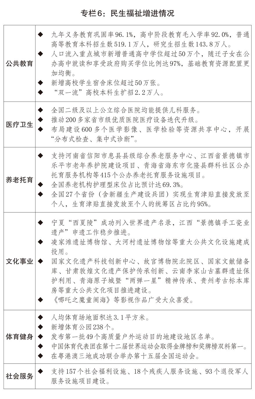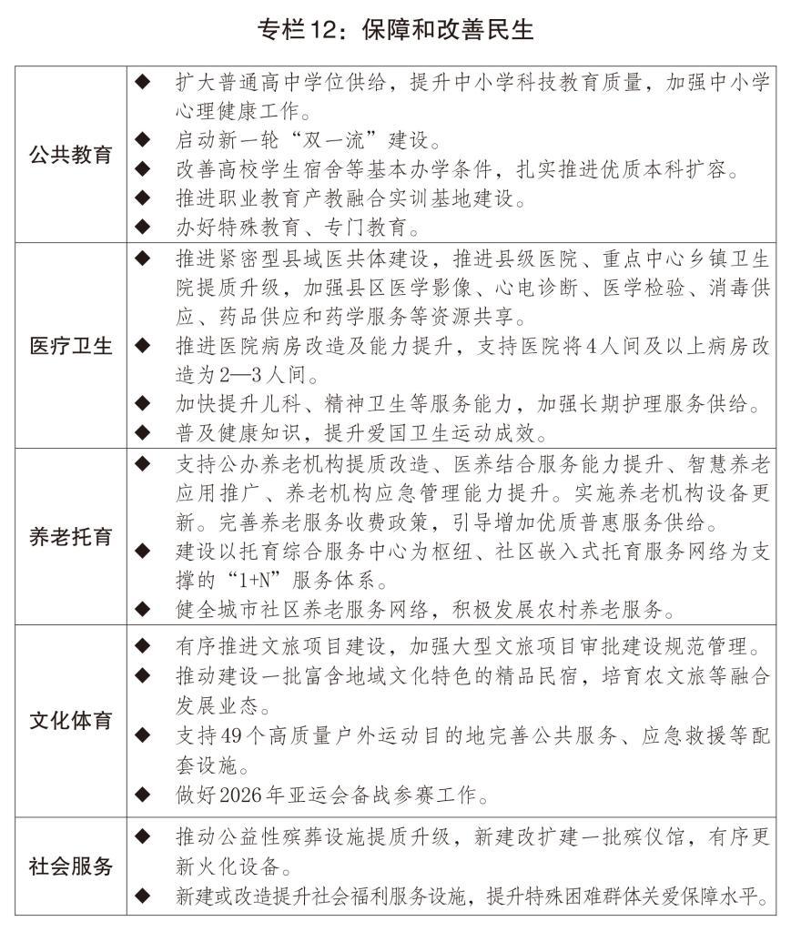 二是構(gòu)建優(yōu)質(zhì)均衡公共服務(wù)體系。穩(wěn)步推進(jìn)基本公共服務(wù)均等化。適應(yīng)學(xué)齡人口變化,優(yōu)化學(xué)前和義務(wù)教育資源配置,增加普通高中學(xué)位供給和優(yōu)質(zhì)高校本科招生。全面推進(jìn)健康學(xué)校建設(shè)。深化實(shí)施醫(yī)療衛(wèi)生強(qiáng)基工程,完善國(guó)家區(qū)域醫(yī)療中心管理體制和運(yùn)行機(jī)制,促進(jìn)優(yōu)質(zhì)醫(yī)療資源擴(kuò)容下沉和區(qū)域均衡布局,加強(qiáng)縣區(qū)、基層醫(yī)療機(jī)構(gòu)運(yùn)行保障。支持心理健康和精神衛(wèi)生、婦女兒童健康服務(wù)體系建設(shè),實(shí)施康復(fù)護(hù)理擴(kuò)容提升工程。健全公共衛(wèi)生防控救治體系。加強(qiáng)慢性病、罕見病防治,全方位提升急診急救、血液保障和應(yīng)急能力。推進(jìn)中醫(yī)藥傳承創(chuàng)新,促進(jìn)中西醫(yī)結(jié)合。推出促進(jìn)銀發(fā)經(jīng)濟(jì)高質(zhì)量發(fā)展的增量政策,培育發(fā)展銀發(fā)經(jīng)濟(jì)龍頭企業(yè),推進(jìn)老年人力資源開發(fā),更好滿足老年人多元化需求。發(fā)展醫(yī)養(yǎng)結(jié)合服務(wù),推行長(zhǎng)期護(hù)理保險(xiǎn),健全失能失智老年人照護(hù)體系。實(shí)施早孕關(guān)愛行動(dòng)、孕育和出生缺陷防治能力提升計(jì)劃。發(fā)揮育兒補(bǔ)貼作用,完善生育保險(xiǎn)、生育休假等制度。推進(jìn)普惠養(yǎng)老托育服務(wù)體系建設(shè),提升社區(qū)養(yǎng)老托育等服務(wù)能力。加強(qiáng)公共設(shè)施適老化和無障礙改造。推進(jìn)高質(zhì)量戶外運(yùn)動(dòng)目的地建設(shè),開展群眾身邊體育運(yùn)動(dòng)空間擴(kuò)容。積極培育群眾賽事。深化家政產(chǎn)教融合,持續(xù)推進(jìn)家政服務(wù)業(yè)提質(zhì)擴(kuò)容。完善困境兒童服務(wù)保障體系,支持社會(huì)福利設(shè)施建設(shè)。