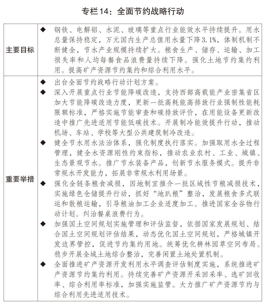 三是加快形成綠色生產(chǎn)生活方式。開展全面節(jié)約戰(zhàn)略行動(dòng),持續(xù)推動(dòng)“能水糧地礦材”一體化節(jié)約。推動(dòng)修訂節(jié)約能源法,修訂重點(diǎn)用能和碳排放單位管理辦法,開展制冷能效提升和綠色照明行動(dòng),推行公共機(jī)構(gòu)能源費(fèi)用托管等市場(chǎng)化節(jié)能模式。深化節(jié)水型社會(huì)建設(shè),擴(kuò)大非常規(guī)水利用規(guī)模,大力發(fā)展節(jié)水產(chǎn)業(yè)。大力開展糧食節(jié)約和反食品浪費(fèi)行動(dòng)。發(fā)展循環(huán)經(jīng)濟(jì),提高垃圾分類和資源化利用水平,加快構(gòu)建廢棄物循環(huán)利用體系,加強(qiáng)再生材料推廣使用。支持氧化鋁提鋰提鎵。支持“以竹代塑”產(chǎn)業(yè)發(fā)展。設(shè)立國(guó)家低碳轉(zhuǎn)型基金,培育氫能、綠色燃料等新增長(zhǎng)點(diǎn)。健全綠色消費(fèi)激勵(lì)機(jī)制,推廣綠色低碳生活方式。