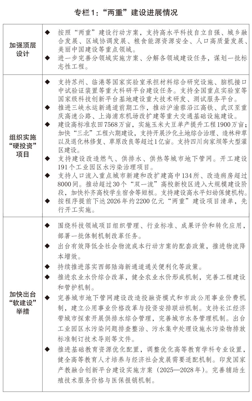 三是高質(zhì)量推進(jìn)“兩重”建設(shè)。牢牢把握戰(zhàn)略性、前瞻性、全局性,強(qiáng)化項(xiàng)目謀劃儲(chǔ)備,優(yōu)化實(shí)施“兩重”項(xiàng)目,著力推動(dòng)國(guó)家重大戰(zhàn)略深入實(shí)施、重點(diǎn)領(lǐng)域安全能力穩(wěn)步提升。安排超長(zhǎng)期特別國(guó)債8000億元支持“兩重”建設(shè),重點(diǎn)支持科技自立自強(qiáng)、未來產(chǎn)業(yè)發(fā)展、農(nóng)業(yè)轉(zhuǎn)移人口市民化、城市地下管網(wǎng)管廊建設(shè)改造、長(zhǎng)江經(jīng)濟(jì)帶生態(tài)環(huán)境保護(hù)、長(zhǎng)江沿線重大交通基礎(chǔ)設(shè)施、西部陸海新通道建設(shè)、高標(biāo)準(zhǔn)農(nóng)田建設(shè)、高等教育提質(zhì)升級(jí)等方面任務(wù)。加強(qiáng)項(xiàng)目審核把關(guān),盡早下達(dá)全部項(xiàng)目清單,同步推動(dòng)“軟建設(shè)”措施落地見效,促進(jìn)形成項(xiàng)目建設(shè)實(shí)施和運(yùn)營(yíng)維護(hù)長(zhǎng)效機(jī)制。加強(qiáng)超長(zhǎng)期特別國(guó)債資金監(jiān)管,合理安排項(xiàng)目建設(shè)與資金撥付節(jié)奏,強(qiáng)化項(xiàng)目與資金匹配。組織中央企業(yè)實(shí)施一批跨區(qū)域跨流域、產(chǎn)業(yè)鏈供應(yīng)鏈較長(zhǎng)的“兩重”建設(shè)項(xiàng)目,引導(dǎo)更多民間資本參與,積極撬動(dòng)信貸資金,切實(shí)放大“兩重”效應(yīng)。嚴(yán)格工程質(zhì)量和安全管理,打造一批精品工程。