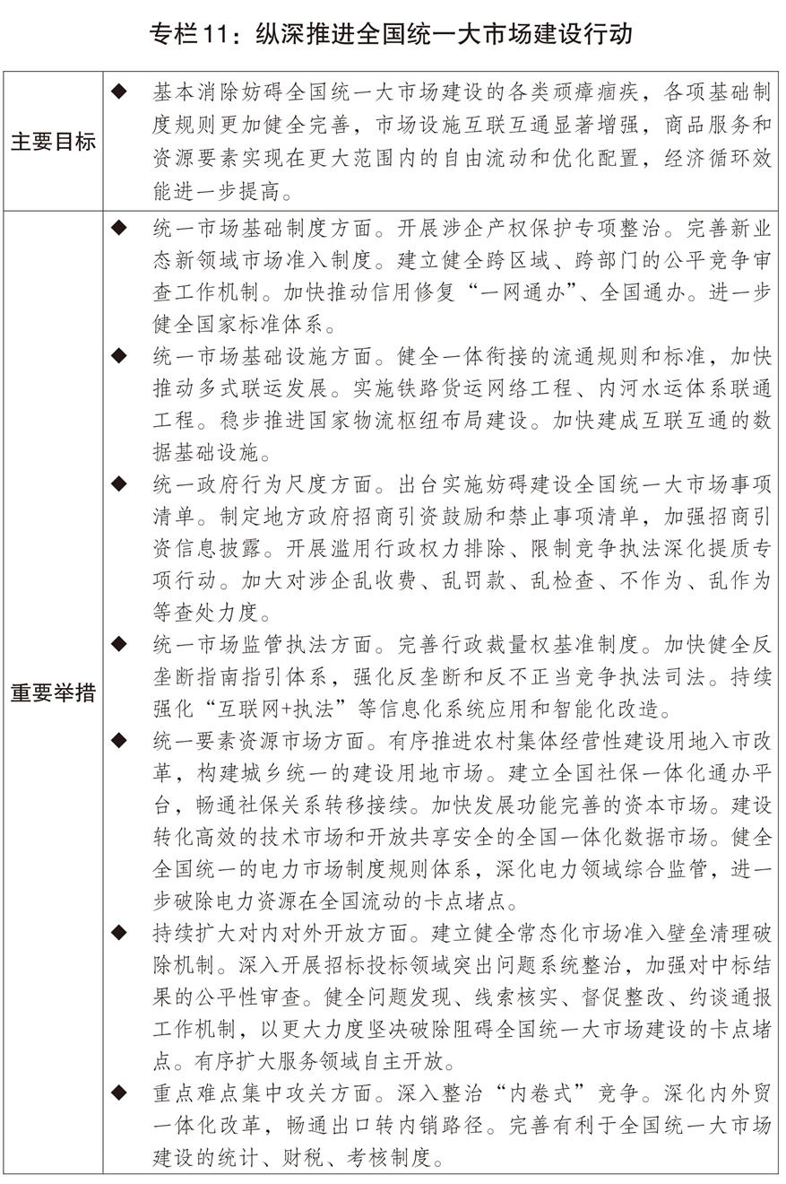 一是加快破除阻礙全國(guó)統(tǒng)一大市場(chǎng)建設(shè)卡點(diǎn)堵點(diǎn)。制定全國(guó)統(tǒng)一大市場(chǎng)建設(shè)條例、縱深推進(jìn)全國(guó)統(tǒng)一大市場(chǎng)建設(shè)工作方案,持續(xù)清理和廢除妨礙全國(guó)統(tǒng)一市場(chǎng)和公平競(jìng)爭(zhēng)的各種規(guī)定和做法。推動(dòng)市場(chǎng)準(zhǔn)入效能評(píng)估省、市、縣三級(jí)全覆蓋。出臺(tái)地方政府招商引資鼓勵(lì)和禁止事項(xiàng)清單,規(guī)范稅收優(yōu)惠、財(cái)政補(bǔ)貼政策。深化綜合交通運(yùn)輸體系改革,持續(xù)降低全社會(huì)物流成本,健全高效順暢的現(xiàn)代流通體系,加快市場(chǎng)基礎(chǔ)設(shè)施高標(biāo)準(zhǔn)聯(lián)通相關(guān)改革,實(shí)施多式聯(lián)運(yùn)攻堅(jiān)行動(dòng),深入推進(jìn)“一單制”、“一箱制”發(fā)展。繼續(xù)推動(dòng)大宗商品骨干流通走廊建設(shè),加快建設(shè)大宗商品資源配置樞紐,提高國(guó)家物流樞紐、國(guó)家骨干冷鏈物流基地、國(guó)家郵政快遞樞紐的物流集散和區(qū)域輻射能力??v深推進(jìn)全國(guó)統(tǒng)一電力市場(chǎng)建設(shè)。加快推動(dòng)制修訂社會(huì)信用建設(shè)法、價(jià)格法等。深化統(tǒng)計(jì)、財(cái)稅、考核制度改革,完善有利于全國(guó)統(tǒng)一大市場(chǎng)建設(shè)的激勵(lì)約束機(jī)制。