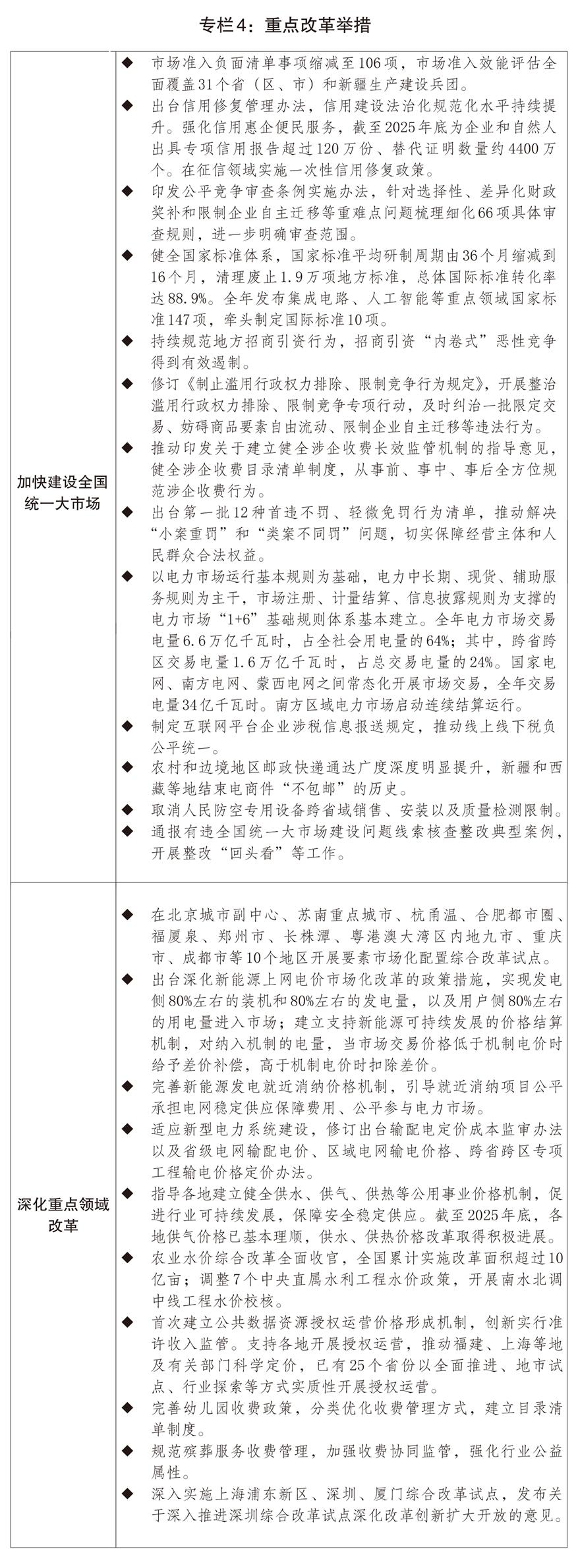 一是全國(guó)統(tǒng)一大市場(chǎng)建設(shè)向縱深推進(jìn)。實(shí)施全國(guó)統(tǒng)一大市場(chǎng)建設(shè)指引,出臺(tái)市場(chǎng)準(zhǔn)入負(fù)面清單(2025年版),清單事項(xiàng)縮減至106項(xiàng)。深入開展市場(chǎng)準(zhǔn)入壁壘清理整治行動(dòng),累計(jì)修訂或廢止相關(guān)文件2300余件。加快建設(shè)統(tǒng)一開放的交通運(yùn)輸市場(chǎng),實(shí)施交通物流降本提質(zhì)增效行動(dòng)計(jì)劃,市場(chǎng)設(shè)施聯(lián)通更加高效順暢。推動(dòng)修訂反不正當(dāng)競(jìng)爭(zhēng)法,出臺(tái)公平競(jìng)爭(zhēng)審查條例實(shí)施辦法,開展整治濫用行政權(quán)力排除、限制競(jìng)爭(zhēng)專項(xiàng)行動(dòng)。持續(xù)規(guī)范地方招商引資行為,招商引資亂象得到有效遏制,地方制定實(shí)施政策的合規(guī)意識(shí)明顯增強(qiáng)。出臺(tái)健全社會(huì)信用體系的意見,構(gòu)建信用修復(fù)制度,建立企業(yè)信用狀況綜合評(píng)價(jià)體系,全面推行以專項(xiàng)信用報(bào)告替代有無違法違規(guī)記錄證明。全國(guó)統(tǒng)一電力市場(chǎng)體系初步建立,跨電網(wǎng)經(jīng)營(yíng)區(qū)常態(tài)化電力交易機(jī)制基本建立,電力現(xiàn)貨市場(chǎng)基本覆蓋全國(guó)。