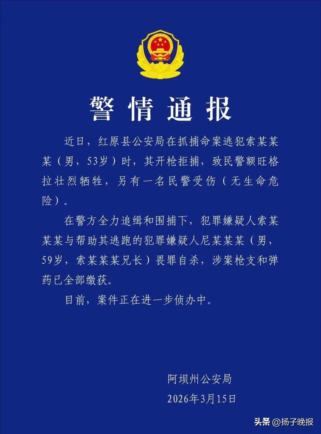 3月15日晚,四川阿壩州公安局發(fā)布警情通報(bào):近日,紅原縣公安局在抓捕命案逃犯索某某某(男,53歲)時(shí),其開槍拒捕,致民警額旺格拉壯烈犧牲,另有一名民警受傷(無生命危險(xiǎn))。