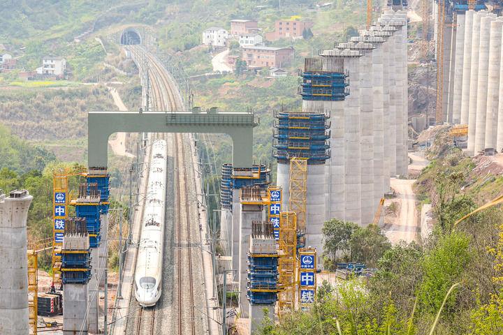 2025年3月27日,在成達(dá)萬高鐵左線福壽跨渝萬城際特大橋項目施工現(xiàn)場,成達(dá)萬高鐵首個跨既有高鐵鋼橫梁吊裝完成,鄭渝高鐵線上一列動車從門式墩鋼橫梁下通過。新華社發(fā)(黃茂程攝)