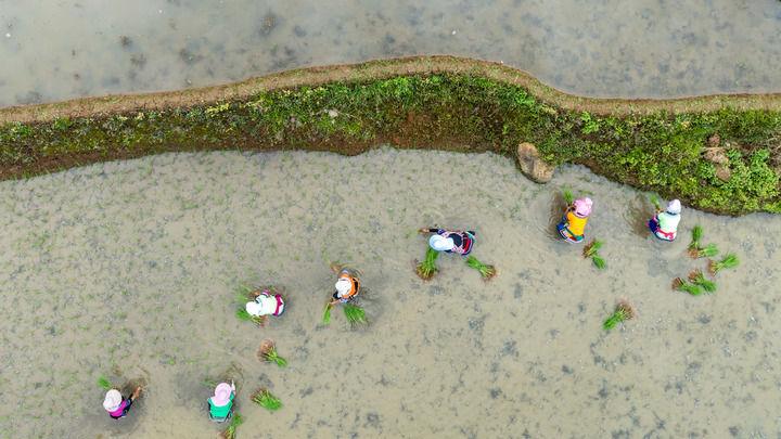 2025年5月2日,在云南省紅河縣甲寅村,村民在梯田里插秧(無人機照片)。新華社記者 胡超 攝