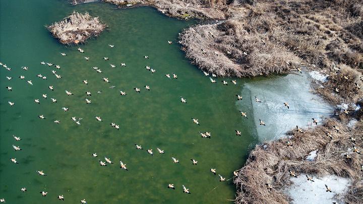候鳥在黃河寧夏段一處濕地棲息、覓食(無人機照片,2025年2月26日攝)。新華社記者 王鵬 攝