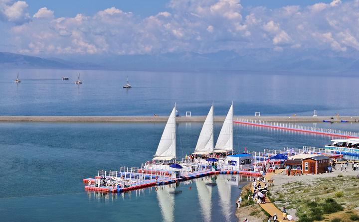 這是2025年7月17日在新疆博爾塔拉蒙古自治州賽里木湖景區(qū)拍攝的電動帆船游玩項目(無人機照片)。新華社發(fā)(張利民攝)