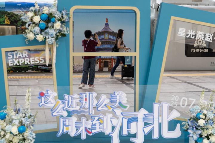 2025年7月9日,在北京站,旅客在京津冀首列觀光旅游列車“星光·燕趙號”旁留影。新華社記者 白雪飛 攝