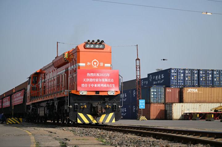 2025年首列天津港經(jīng)霍爾果斯直達(dá)塔什干的中亞班列從天津港物捷三堆場(chǎng)發(fā)車(2025年5月20日攝)。新華社記者 趙子碩 攝