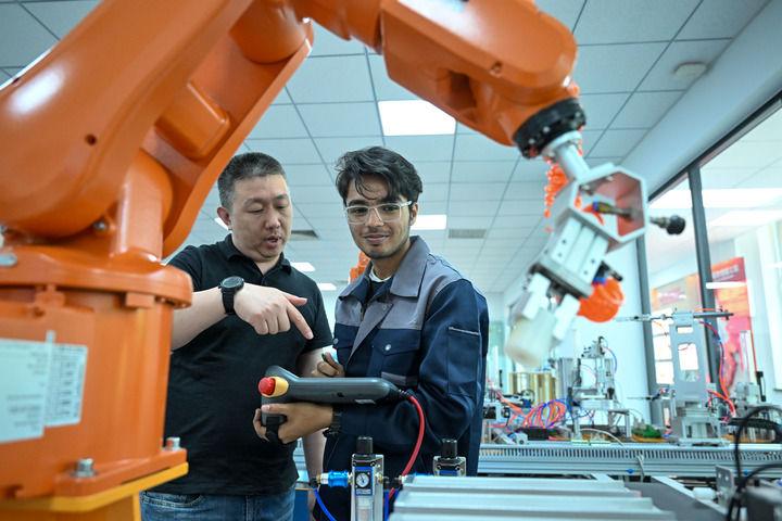 在天津現(xiàn)代職業(yè)技術(shù)學(xué)院魯班工坊實(shí)訓(xùn)教室,教師指導(dǎo)學(xué)生操作設(shè)備(2025年6月16日攝)。新華社記者 孫凡越 攝