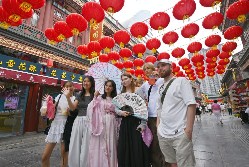 8月14日,上合組織國(guó)家學(xué)生在天津古文化街留影。新華社記者李然攝
