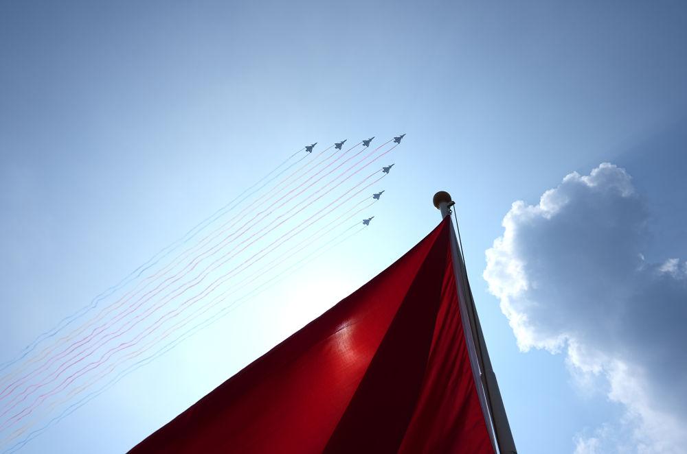 2025年9月3日,紀(jì)念中國人民抗日戰(zhàn)爭暨世界反法西斯戰(zhàn)爭勝利80周年大會在北京隆重舉行。這是教練機(jī)梯隊(duì)接受檢閱。新華社記者 朱崢 攝