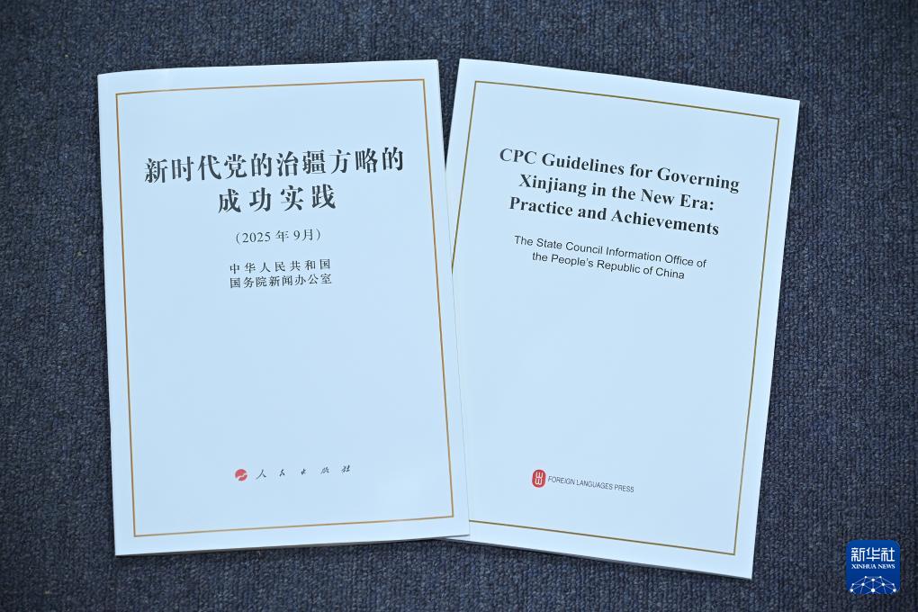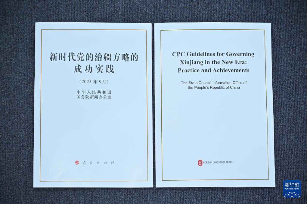 9月19日,國(guó)務(wù)院新聞辦公室在北京舉行新聞發(fā)布會(huì),發(fā)布《新時(shí)代黨的治疆方略的成功實(shí)踐》白皮書,中央宣傳部副部長(zhǎng)王綱,新疆維吾爾自治區(qū)黨委副書記、自治區(qū)主席艾爾肯·吐尼亞孜,新疆維吾爾自治區(qū)黨委常委、自治區(qū)常務(wù)副主席陳偉俊,新疆維吾爾自治區(qū)黨委常委、宣傳部部長(zhǎng)王建新出席,介紹白皮書有關(guān)情況并答記者問(wèn)。這是《新時(shí)代黨的治疆方略的成功實(shí)踐》白皮書。新華社記者 李鑫 攝